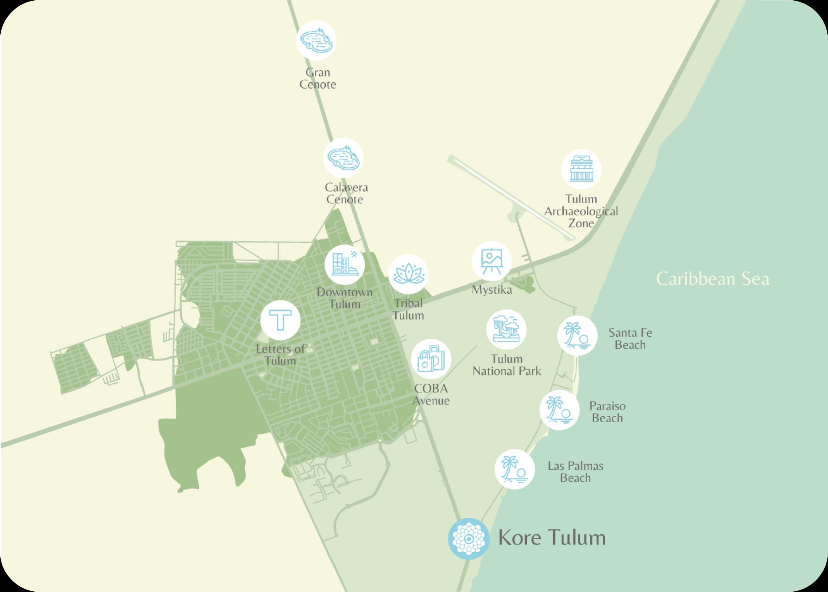 From Cenote Cristal, located just 5 minutes from Kore Tulum, which has impressive rock formations, to Cenote Escondido, which has a jumping platform and a zip line, as well as Cenote Calavera, famous for its entrance in the shape of a hole in the roof.